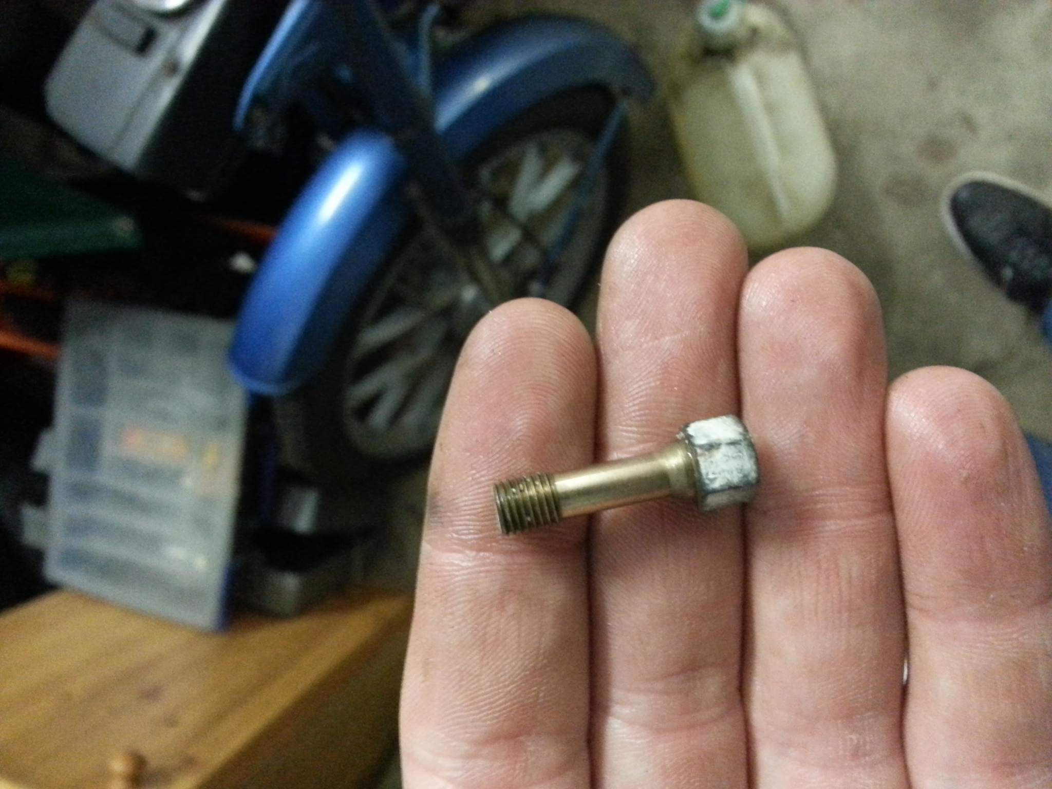 Das Ding habe ich so aus dem Vergaser geschraubt... bisschen schmatig zum einen. Zum anderen ist unter ein Gewinde ohne was drin. Wenn ichs richtig gedeutet habe gehört da die Vergaserdüse rein. Ist aber keine drin....neu bestellt... also abwarten