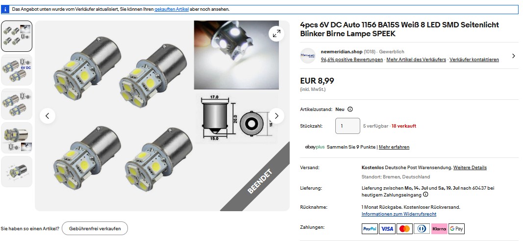 Ich habe aber alles auf LED umgerüstet, sogar die Cockpitanzeige mit diesen Dingern: LED weiß mit Vorwiderstand 150 Ohm.